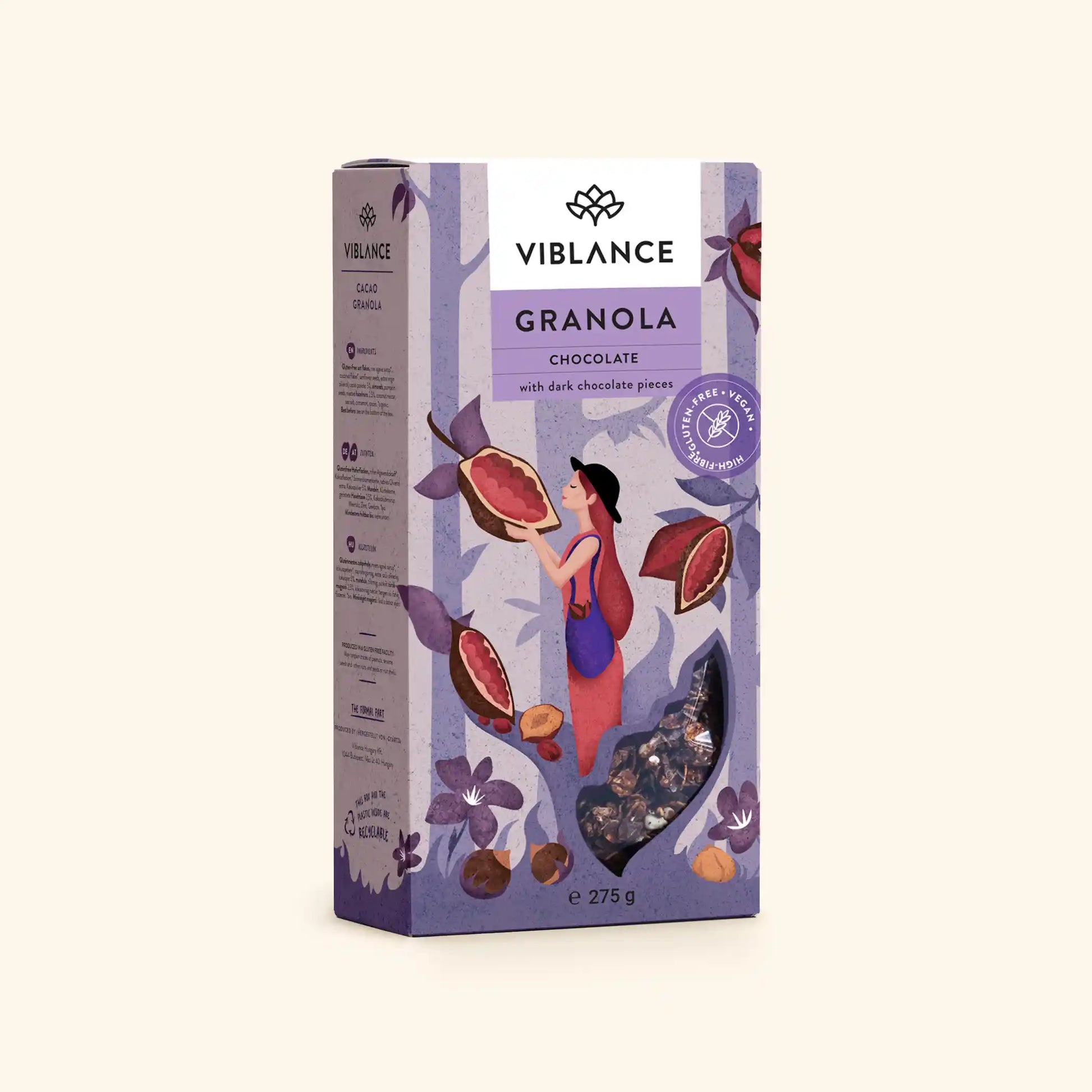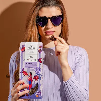 Ce granola au cacao est un favori des enfants et des adultes qui ne veulent pas grandir, qui est aromatisé avec le cacao le plus doux qui existe. Une véritable délicatesse édifiante dont le caractère est accentué par le nectar naturel de noix de coco. Un bon ami du cacao, les noisettes croustillantes, complètent l'expérience gustative tandis que la noix de coco et les épices fruitées le rendent léger. Ne soyez pas surpris si votre petit-déjeuner devient le point culminant de votre journée...